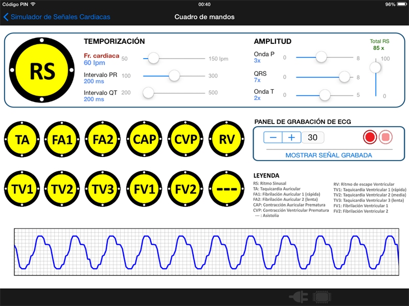 Este es la pantalla principal del simulador. Desde esta pantalla se podrán seleccionar los diferentes ritmos cardiacos simulables.